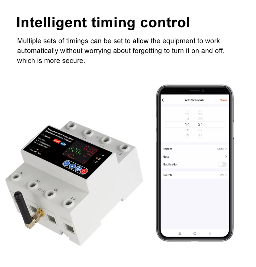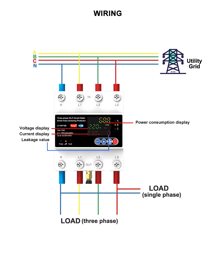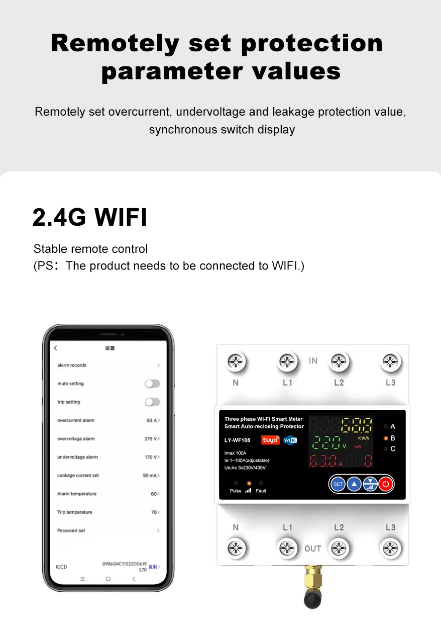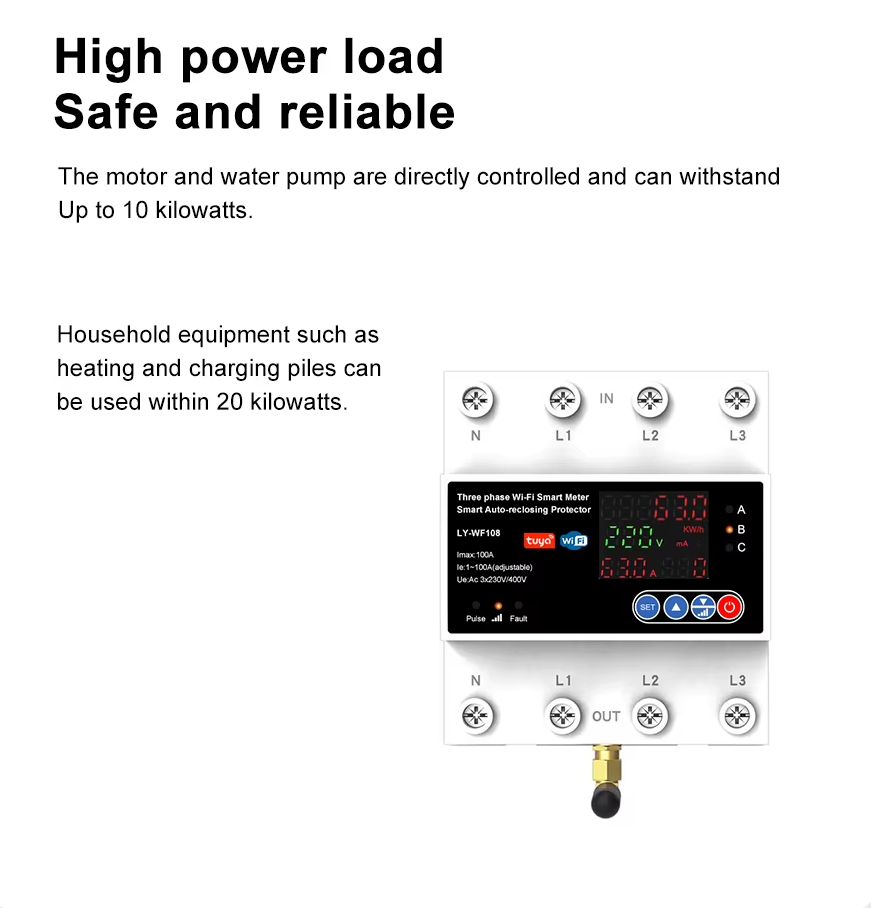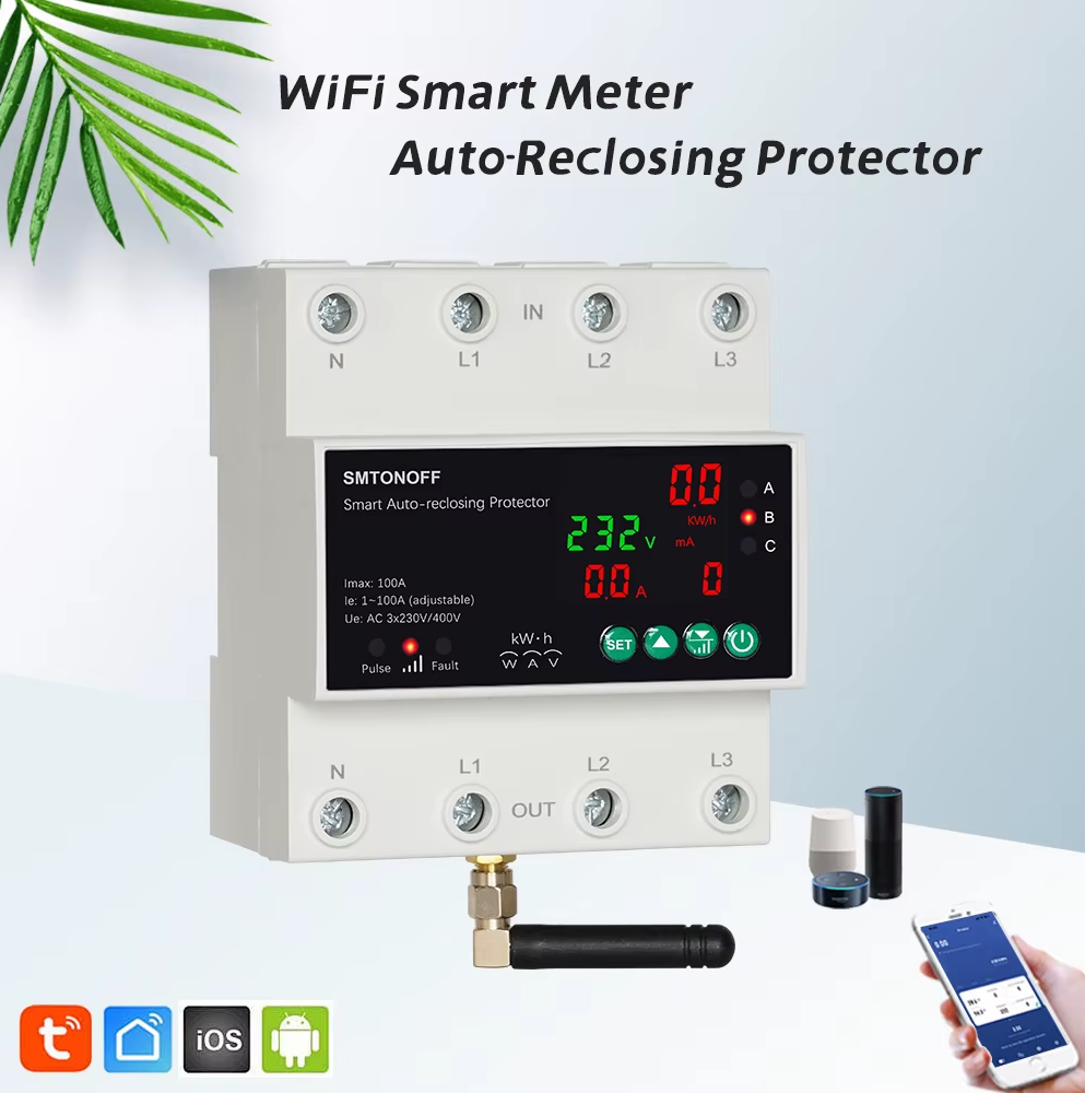 Este dispositivo IOT inteligente de diseño todo en uno se aplica a CA 230 V/400 V, 50/60 Hz, corriente nominal de hasta 63 A/100 A monofásica o trifásica.